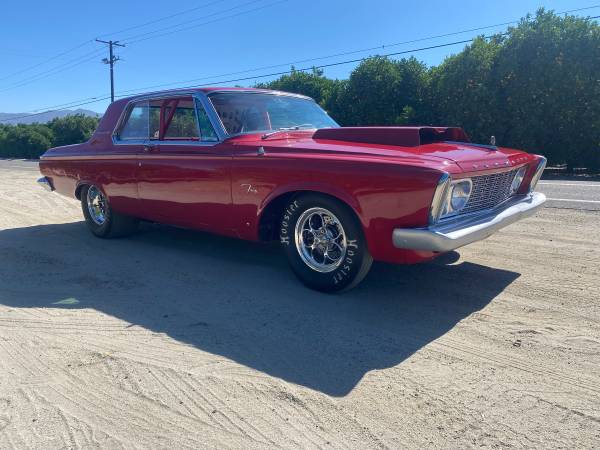 63 Plymouth Fury, Street/strip car, stroked 440 to 500", Ohio Crank, JE pistons, 10-1 compression, CNC ported Edelbrock heads from Hughes, Lunati .625 lift solid cam, Victor intake, 850 HP Holley carb, MSD ignition distributor, Digital 6 box, TTI 2" primary headers, with full 3" TTI exhaust. Be Cool aluminum radiator, Chrysler 833 4 speed, dual disc clutch, Hurst competition shifter, Inland Driveline aluminum drive shaft, Mosier Dana 60 with 35 spline axles, 4.10 gears and a spool. Calvert racing Caltrac bars, split mono-leafs, and adjustable shocks, 4 wheel Wilwood slotted and cross drilled disc brakes, with Wilwood Master cylinder and line lock. Weld Magnum Wheels, with Hoosier tires all around, 29.5x10.5 in the rear, Aluminum fuel cell, Mallory comp 140 pump, Car is mini tubbed with leafs move inboard, 6 point roll Bar, A100 bucket seats, 5 point harnesses, Max Wedge scoop, Car is all steel currently aside from the scoop and front bumper, but I have the stock front bumper, as well as fiberglass hood, deck lid, and rear bumper that are included. Also have a new carpet kit I'll include. Car runs great, drive it anywhere on pump gas. Clean AZ title in hand, registration is current. $24K Firm or may consider a trade for ? Text is the best way to reach me. (951)537-8 8 30 Dodge mopar savoy max wedge Belvedere 340 383 440 426 Hemi muscle car hot rod drag car race Chrysler